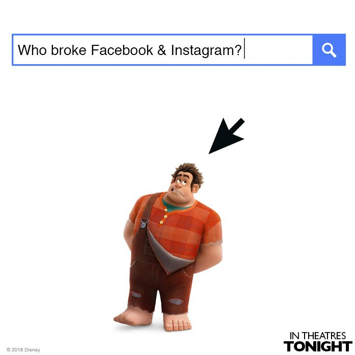 “Xin lỗi về điều đó” - Ralph đã tweet như thế kèm theo hashtag #FacebookDown #InstagramDown #RalphBreaksTheInternet. Ngoài ra, bức ảnh được đăng lên chính là khoảnh khắc mọi người tìm kiếm câu trả lời cho việc “Ai đã phá hỏng Facebook & Instagram”.