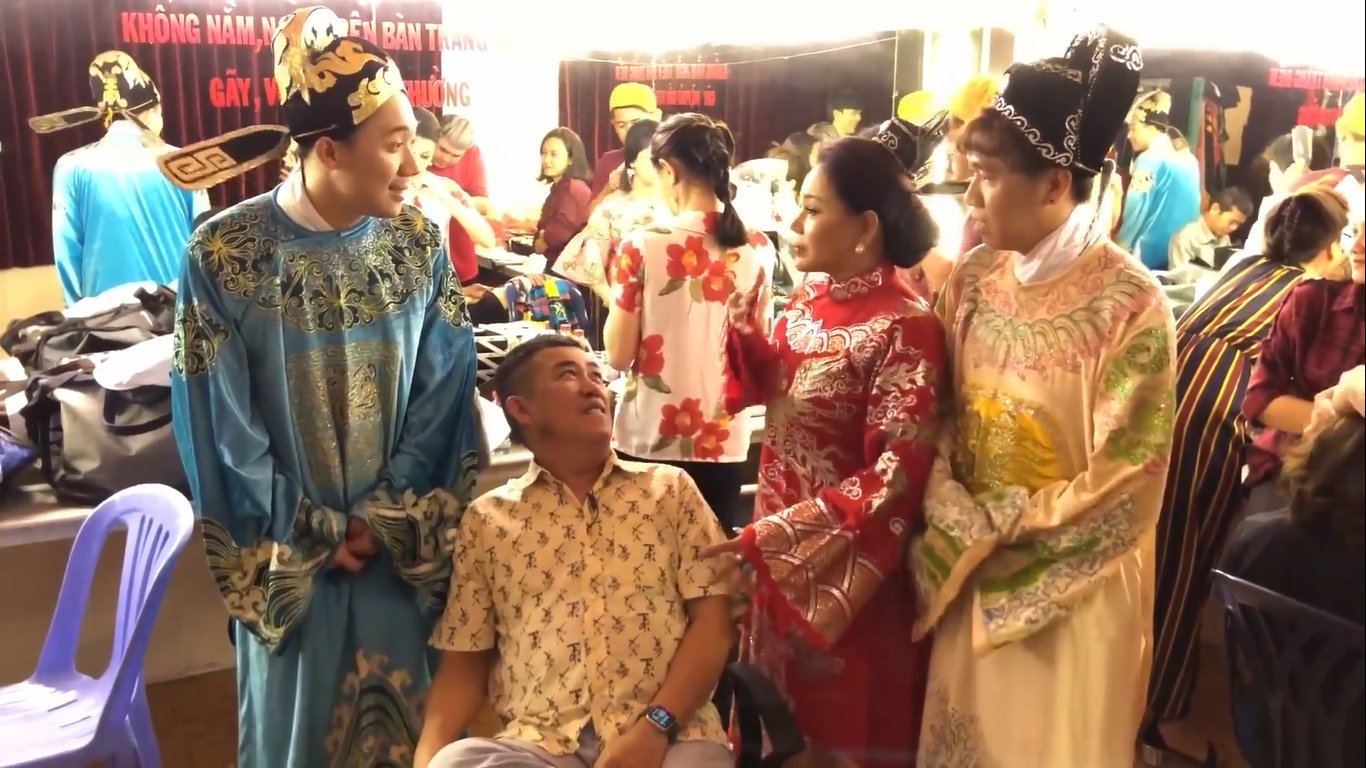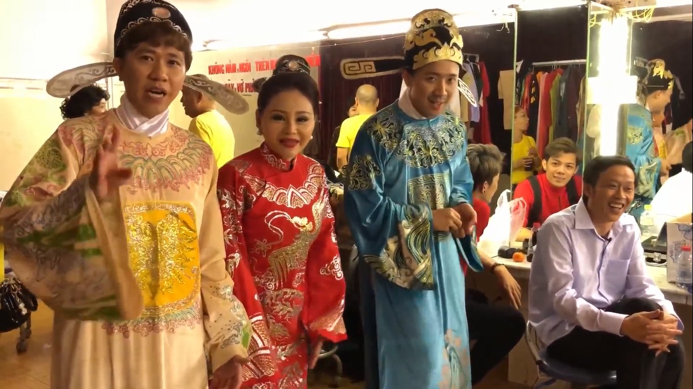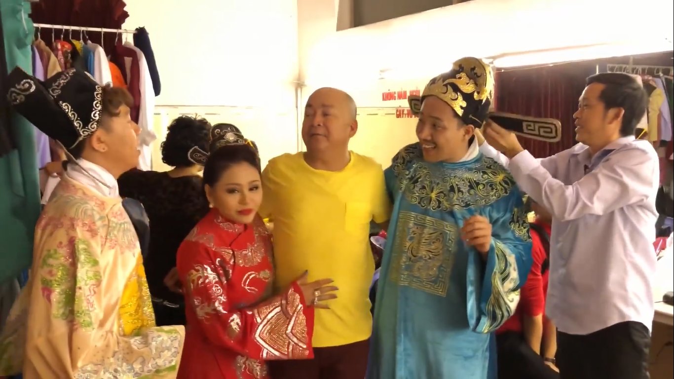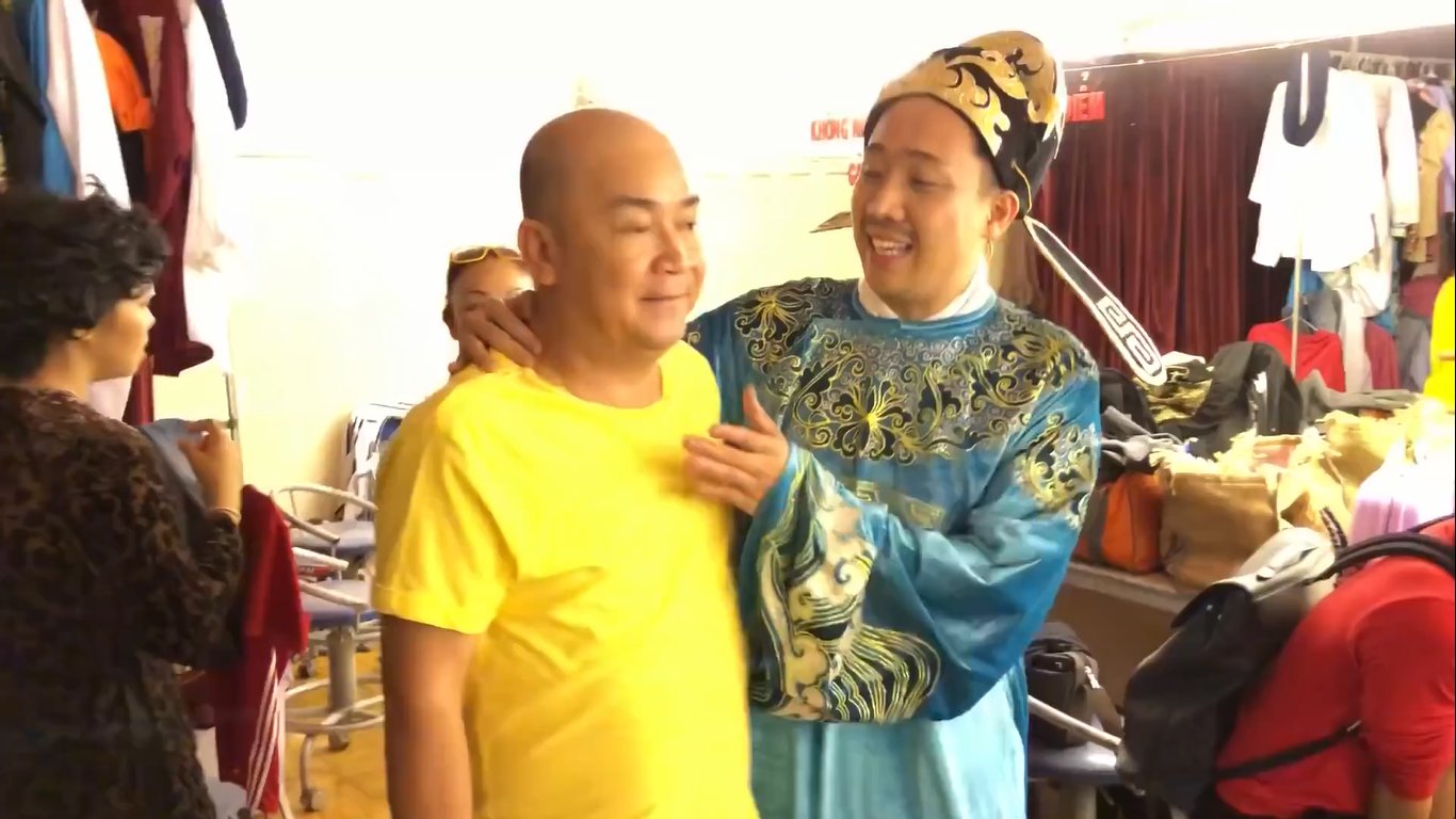 Hoài Linh ân cần chỉnh lại trang phục cho Trấn Thành.