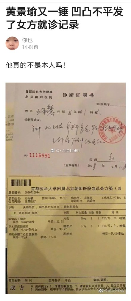 Mới đây nhất, tài khoản weibo này còn đăng lên tấm giấy khám bác sĩ chứng minh Hoàng Cảnh Du đã bạo lực gia đình như muốn tăng thêm tính thuyết phục. Ngoài ra còn nói Vương Vũ Hinh từng đã có con và cha của đứa bé không ai khác chính là Hoàng Cảnh Du.