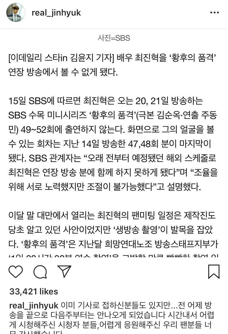 Ngày sau khi thông báo này được chia sẻ rộng rãi, người hâm mộ của Choi Jin Hyuk đã trực tiếp bày tỏ mối quan tâm sâu sắc về việc sẽ không theo dõi những tập phim tiếp theo của Hoàng hậu cuối cùng. Bên cạnh đó, nam diễn viên đã cập nhật Instagram và chia sẻ: “Chắc có một số bạn đã nhận được thông báo rồi, nhưng tôi sẽ không có mặt vào tuần tới sau tập phim phát sóng ngày hôm qua. Tôi rất biết ơn những khán giả theo dõi trong thời gian và những người hâm mộ ủng hộ chúng hết mình”.