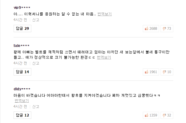 2. [+1961, -10] Bố của Hoàng đế đã sử dụng thắt lưng của mình như một cây roi để đánh anh ấy, và mẹ Hoàng đế đã hỏa thiêu một chú chim mà anh ấy yêu thích..Sống trong môi trường thế này hỏi sao một đứa trẻ có thể lớn lên bình thường chứ ㄷㄷ