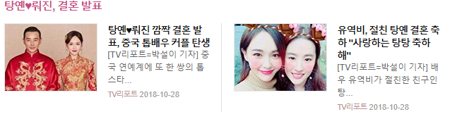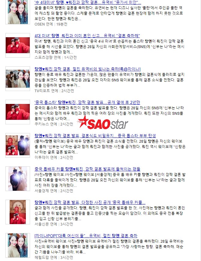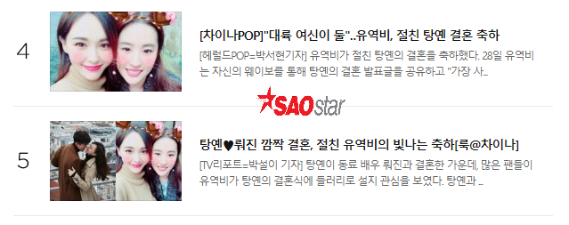 Vào ngày 28/10, loạt truyền thông nổi tiếng xứ Kim Chi đăng tải những thông tin liên quan đến hôn lễ của ngôi sao Trung Quốc, Đường Yên và La Tấn. Trong đó, 헤럴드POP đã đăng tải bài báo với tiêu đề: “Hai nữ thần Đại Lục, Lưu Diệc Phi chúc mừng đám cưới Đường Yên”.