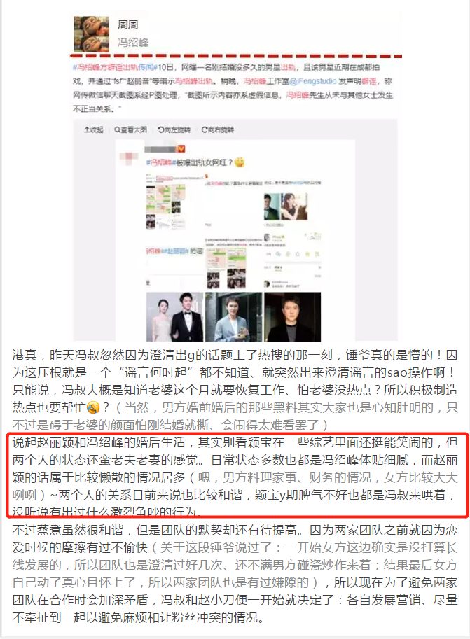 Gần đây, có blogger tiết lộ thực ra cuộc sống hôn nhân giữa Phùng Thiệu Phong và Triệu Lệ Dĩnh vô cùng hòa thuận. Trong cuộc sống hằng ngày, Phùng Thiệu Phong vô cùng ân cần, chu đáo, sẽ chủ động lo liệu mọi chuyện trong nhà. Trong khi đó Triệu Lệ Dĩnh dù có hơi bất cẩn, nhưng Phùng Thiệu Phong vô cùng yêu thương với cô, hai người họ trước giờ chưa từng xảy ra tranh cãi kịch liệt.