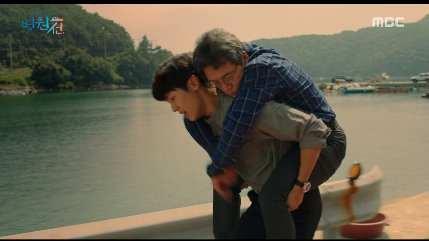 Bác sĩ Kwak Hyun cõng thầy Sol Kye Chan đi cấp cứu.
