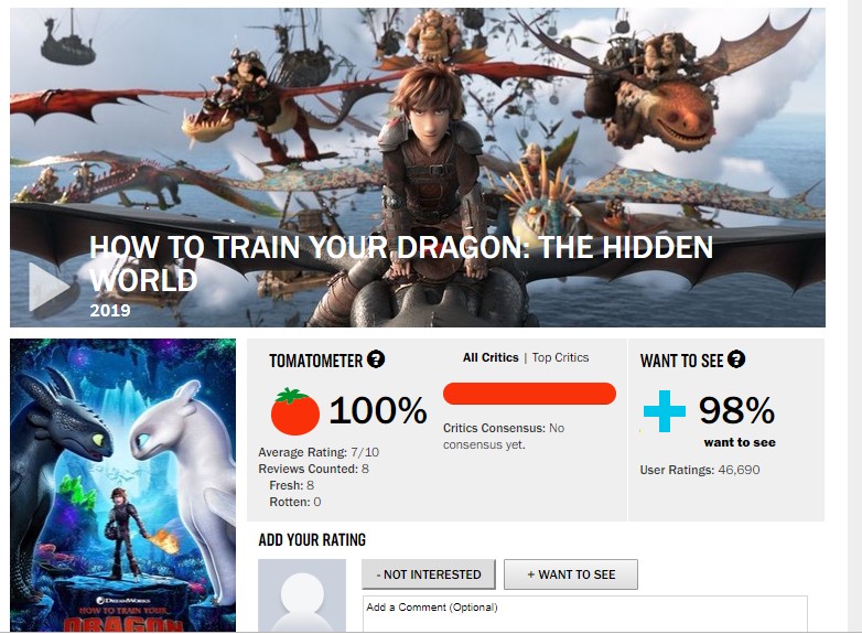 Vậy là số điểm của phần hậu truyện Bí kíp luyện rồng mang tên How to Train Your Dragon: The Hidden World (Bí kíp luyện rồng: Vùng đất bí ẩn) đã được công bố. Với 8 review từ giới phê bình của các website tiếng tăm như The Hollywood Reporter, Variety hay The Wrap, How to Train Your Dragon: The Hidden World hiện đang có được số điểm tối đa 100% “tươi” trên Rotten Tomatoes.
