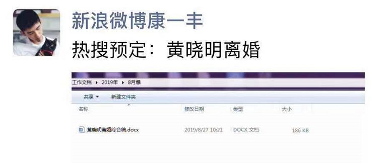 Hôm nay (29.08), nhân viên Sina đột nhiên đăng bài viết dưới chế độ bạn bè, “Hot search dự kiến: Huỳnh Hiểu Minh ly hôn“. Nội dung hình ảnh bên trong chính là văn bản word đã được Sina Weibo hoàn thiện cách đây hai ngày. Ngày sửa đổi cuối cùng là 27.08.2019, tức là bản thảo này đã được hoàn thành, và hai ngày qua không hề được chỉnh sửa thêm bất kỳ điều gì. Tên thư mục chứ file có tiêu đề là: “Tháng 8 bạo”. (Bạo ám chỉ tin nóng, bùng nổ truyền thông).