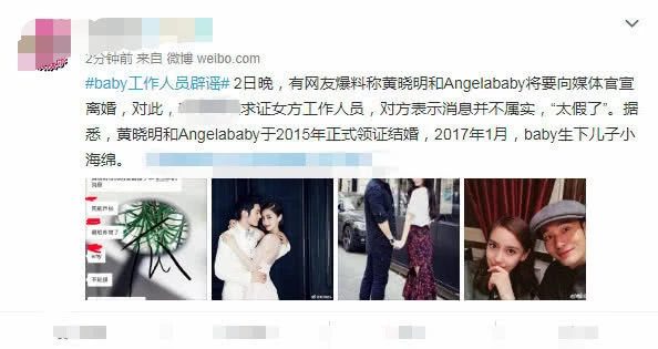 Ngày 02.07, bất ngờ trên mạng lan truyền tin đồn Huỳnh Hiểu Minh và Angelababy đã ly hôn. Kiểu tin này khiến dân mạng lập tức bàn tán và tạo ra nhiều tranh luận lớn nhỏ trên những trang mạng. Nhân viên công tác của phòng làm việc của Angelababy cũng nhanh chóng phản hồi, lên tiếng bác bỏ tin đồn, biểu thị tin tức giả.