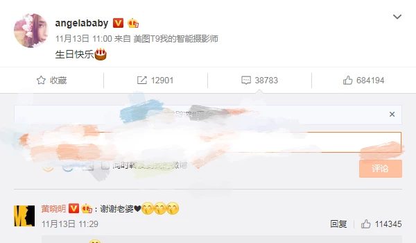 Vào 11h trưa hôm đó, Angelababy mới đăng bài chúc mừng sinh nhật Huỳnh Hiểu Minh, anh liền hồi đáp: “Cảm ơn bà xã“. Với hành động lần này xem như là câu trả lời lên tiếng thanh minh cho tin đồn hôn nhân xảy ra biến động.