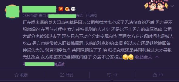 Ngày 20.11, một blogger nổi tiếng cho biết: “Cặp vợ chồng minh tinh đang náo loạn ly hôn vì lợi ích của công ty, dấy lên mâu thuẫn không thể nào bao dung. Phía nam không muốn ly hôn nhưng trong quá trình hai người tranh đấu, tình cảnh của nữ chính không thuận lợi, về phương diện công ty không chiếm được nhiều lợi ích.