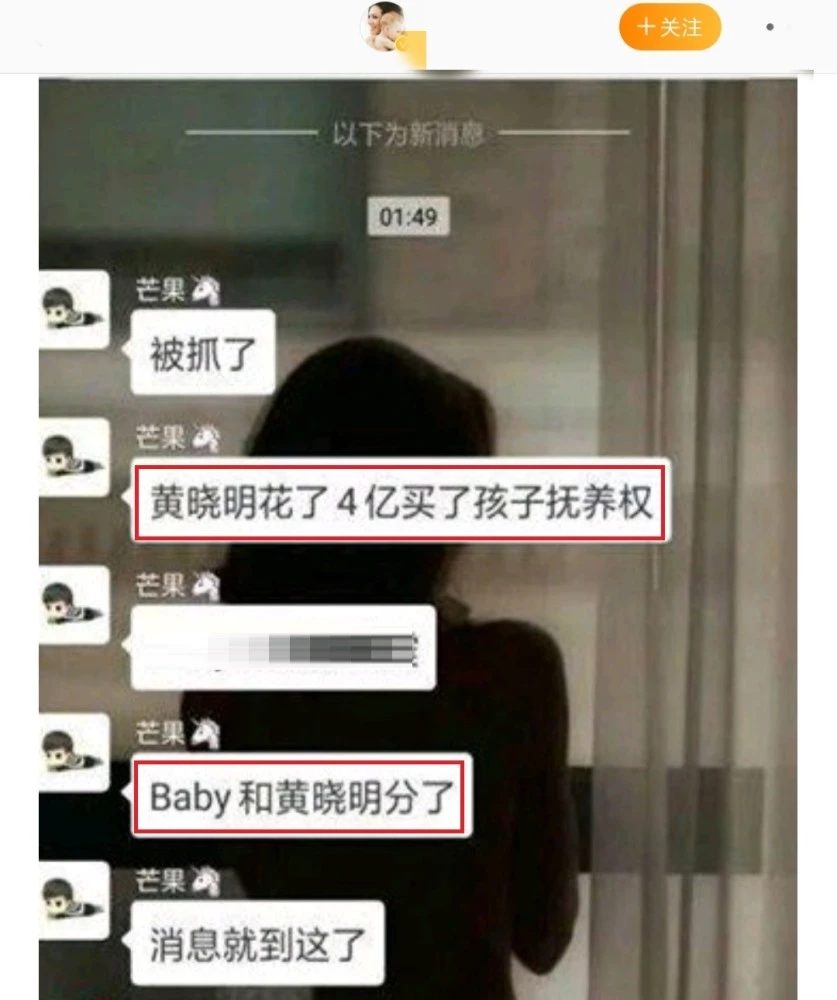 Mới đây, hình ảnh được lan truyền trên mạng được xem là đoạn tin nhắn giữa một người trong giới giải trí đang tiết lộ câu chuyện về hôn nhân giữa Huỳnh Hiểu Minh và Angelababy. Theo đó, nội dung này cho biết Huỳnh Hiểu Minh đã chi 400 triệu NDT (1300 tỷ đồng) để giành quyền nuôi con trong cuộc chiến ly hôn với Angelababy.