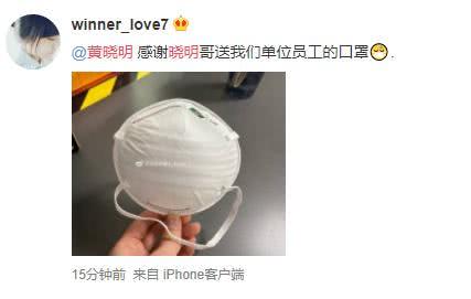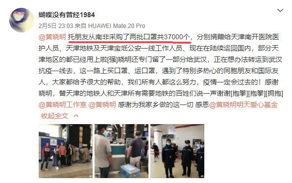Ngoài ra, vào tối ngày 5, có blogger cho biết Huỳnh Hiểu Minh đã nhờ bạn mua hai thùng khẩu trang từ Nam Phi, tổng cộng có 37000 chiếc, lần lượt quyên góp cho nhân viên tuyến một ở bệnh viện Nam Khai Thiên Tân, Tàu điện ngầm Thiên Tân và Công an khu Bảo Trì Thiên Tân. Bây giờ đã có người sử dụng rồi. Có một phần khẩu trang mà Huỳnh Hiểu Minh nhất định sẽ chuyển tới Vũ Hán.