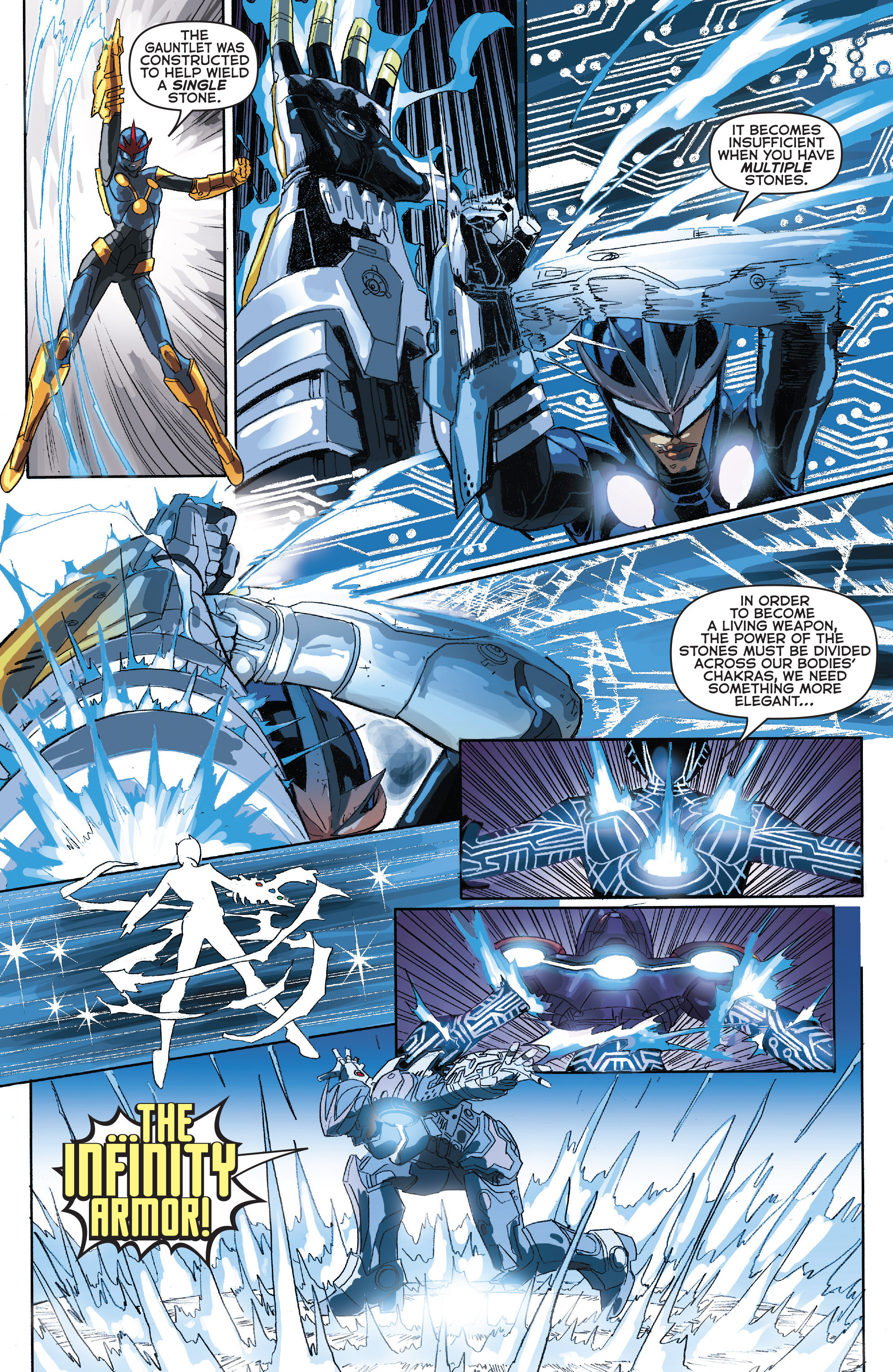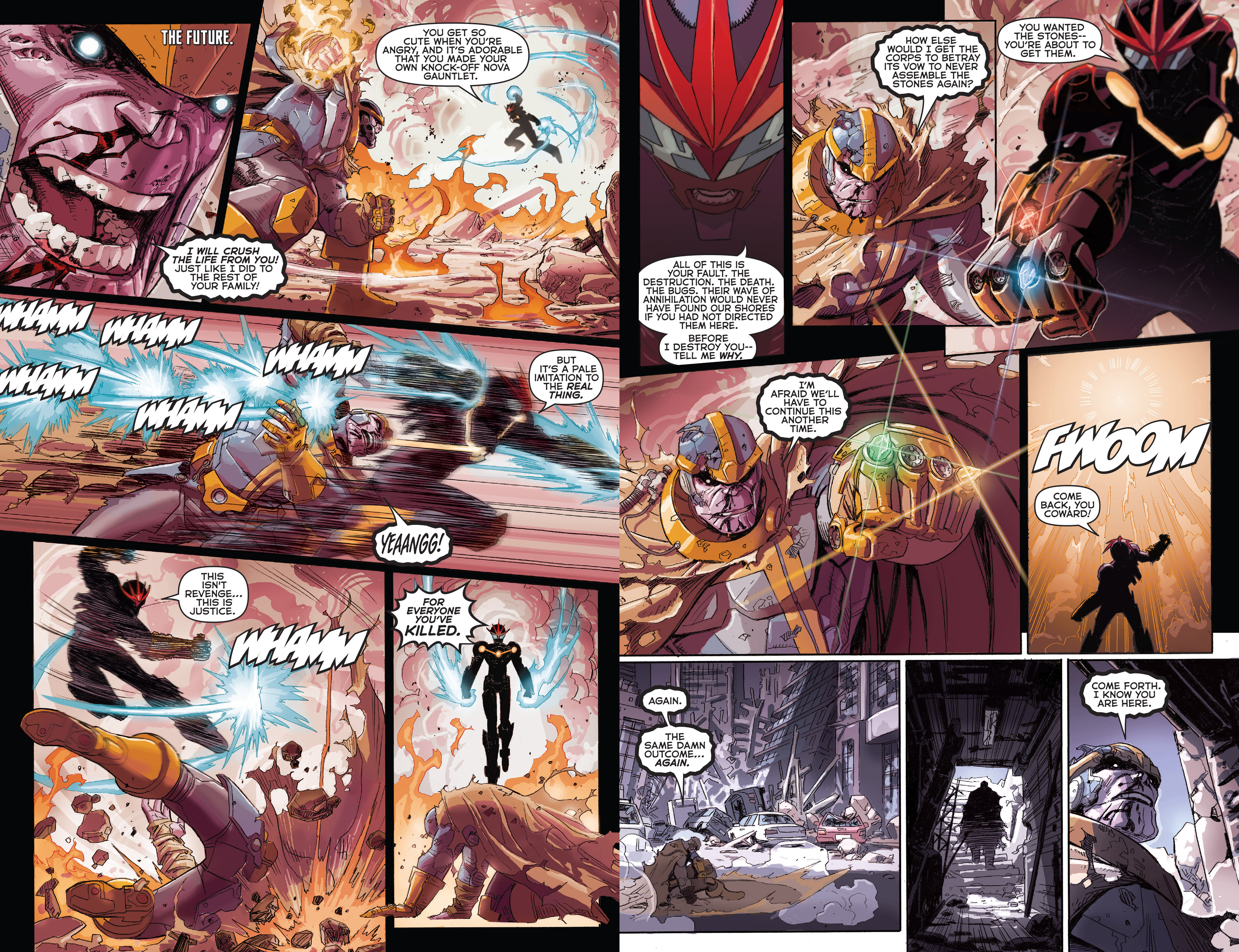 Không chỉ Eve, mà Anwen Bakian cũng có thể thực hiện được trò này. Trong tương lai của thực tại này, Thanos - với hai Viên đá Vô Cực đã liên tục thất bại và bị đánh cho thân tàn ma dại dưới tay một chiến binh Nova sử dụng bộ giáp Infinity Armor, đến mức phải liên tục dùng sức mạnh của Viên đá Thời Gian để “reset”. Chiến binh Nova đó chính là Anwen, và đoán xem, trên tay cô là chiếc găng bản sao và chỉ có đúng một Viên đá Vô Cực. Điều này hoàn toàn cho thấy việc áp dụng cách thức đó thậm chí còn hiệu quả hơn so với việc sử dụng găng tay thuần túy.