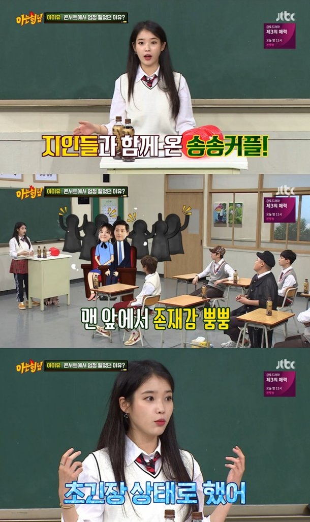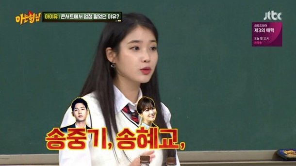 Trong tập phim mới nhất của show truyền hình Knowing Brothers phát sóng vào ngày 27/10 vừa qua, nữ ca sĩ kiêm diễn viên IU và “hoàng tử cổ trang” Lee Jun Ki tham gia với tư cách là khách mời. Trong quá trình trao đổi với những thành viên của chương trình, nữ ngôi sao sinh năm 1993 chia sẻ: “Tiền bối Song Hye Kyo, Song Joong Ki, và Park Sol Mi đã xuất hiện ở buổi concert của em. Khi em lên biểu diễn, anh chị ấy đã ngồi dưới sân khấu rồi. Bọn em chạm mắt nhau, lúc đó, em cảm thấy đầu óc trống rỗng, chỉ toàn màu trắng”.