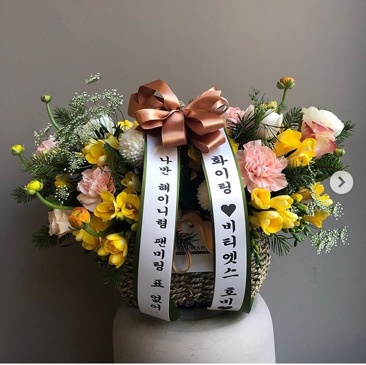 Vào ngày 02/04, một tài khoản của cửa hàng bán hoa Hàn Quốc đã đăng tải một bức ảnh chụp của một giỏ hoa lên mạng xã hội Instagram. Được biết, đây là một món quà tinh thần do nam ca sĩ trẻ J-Hope (BTS) đặt hàng để gửi đến buổi họp fan của diễn viên Jung Hae In đã được diễn ra vào ngày 30/03 vừa rồi.