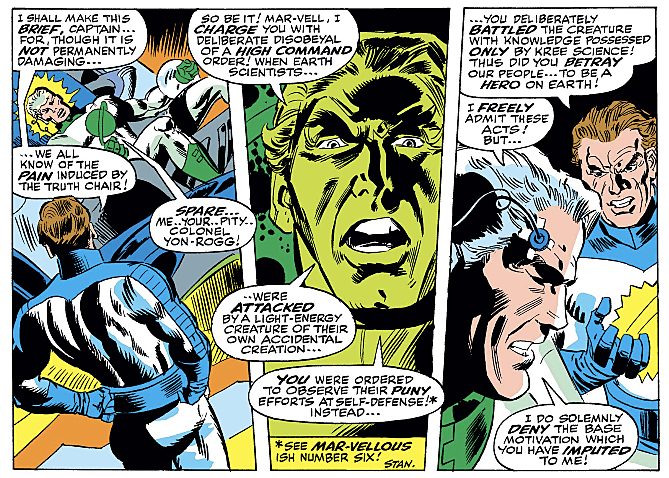 Ở đây có một ví dụ khá điển hình về thể loại trò chơi cờ vua diễn ra giữa Mar-Vell và Yon-Rogg. Đây là kết quả âm mưu của Yon-Rogg, Mar-Vell được đưa vào thử nghiệm (anh ấy thực sự bị thẩm vấn bởi Ronan the Accuser từ Guardians of the Galaxy, người cũng sẽ xuất hiện trong Captain Marvel). Và người trong bộ trang phục xanh trắng là Yon-Rogg.