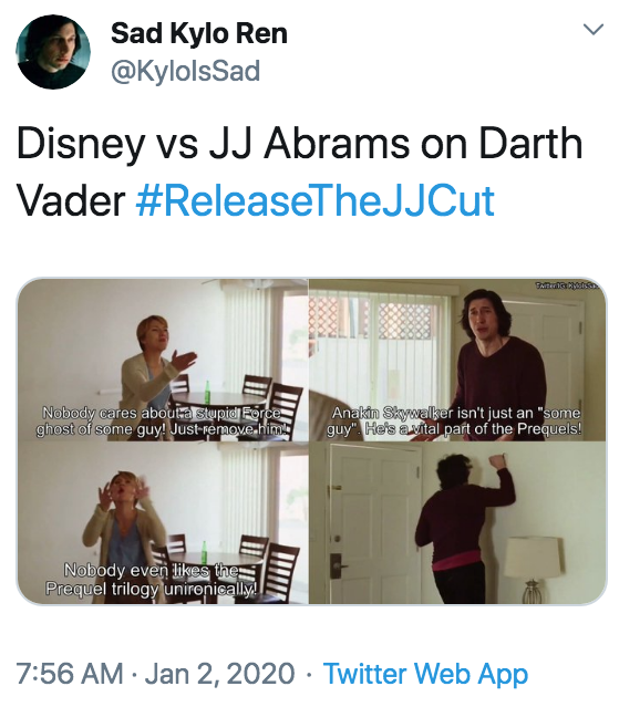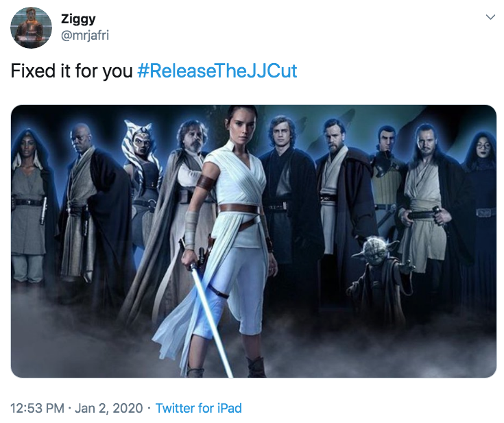 Minh chứng rõ ràng nhất chính là người hâm mộ Star Wars cũng đã lập nên chiến dịch #ReleaseTheJJCut khi tác phẩm Star Wars: The Rise of Skywalker ra mắt năm 2019 không được như những gì họ kỳ vọng. Theo Drew Taylor, việc làm này là “vô cùng lố bịch” khi các fans luôn mong đợi vào một bản phim xuất sắc nhưng đã bị bỏ qua dù không hề chắc chắn nó có tồn tại hay không.