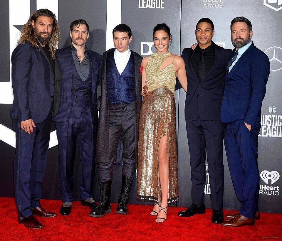 Từ trái sang phải: Jason Momoa, Henry Cavill, Ezra Miller, Gal Gadot, Ray Fisher và Ben Affleck