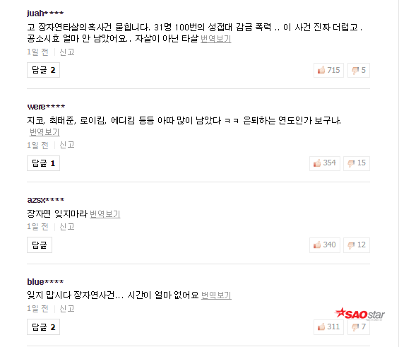 “Vụ cố diễn viên Jang Ja Yeon bị chìm trong một trường hợp đáng ngờ. 31 kẻ bạo lực tình dụng hơn 100 lần…vụ này này thực sự bẩn thỉu…Không còn bao lâu nữa là có buổi công bố đó, không phải tự sát mà là giết hại”, ” Đừng quên Jang Ja Yeon”, “Mọi người đừng quên vụ Jang Ja Yeon…không còn nhiều thời gian nữa đâu”.