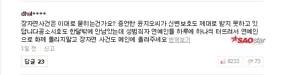 Có phải vụ án của Jang Ja Yeon bị chôn vùi theo cách này không? Yoon Ji Oh, người đã làm chứng nói rằng cô ấy cũng không nhận được sự bảo vệ nghiêm ngặt nữa. Giờ chỉ còn lại khoảng 1 tháng nữa thôi, sao cứ mỗi ngày lại khui những người nổi tiếng phạm tội tình dục, rồi từng người một, để biến thành một chủ đề nóng, xin vui lòng đưa trường hợp của Jang Ja Yeon lên trang chủ.