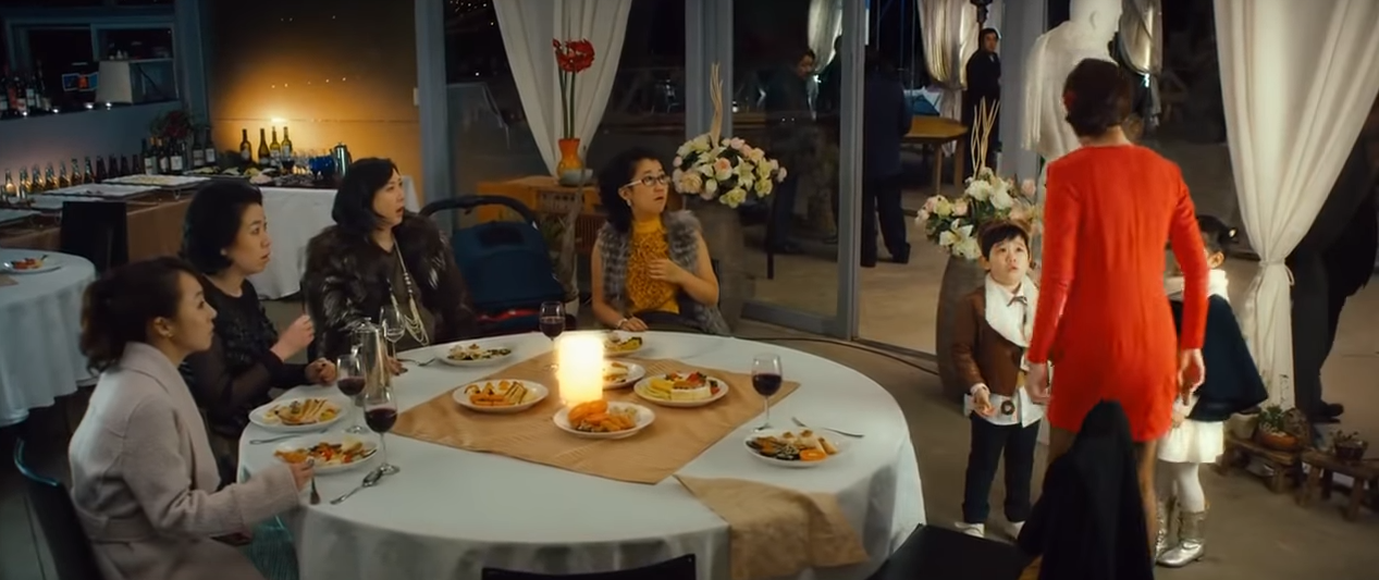 Tại bữa tiệc, anh chồng nói rằng vợ bị ngã và phải chống nạng, chưa nói dứt lời thì từ xa chị vợ đã xuất hiện vô cùng lộng lẫy khiến không ít người phải bất ngờ. Trong quá trình ăn uống, những bà vợ liên tục xỉa xói về cô ấy. Đáp lại những lời nói đó, chị vợ đã có màn ứng đáp khôn ngoan, thông minh. Khi những đứa trẻ con làm ồn, quậy phá, cô ấy đã quát nạt bọn trẻ. Anh chồng vô tình nhìn thấy và đến khuyên vợ. Họ đang tranh cãi thì cây nạng vướng vào khăn trải bàn khiến bàn ăn trở nên hỗn độn.