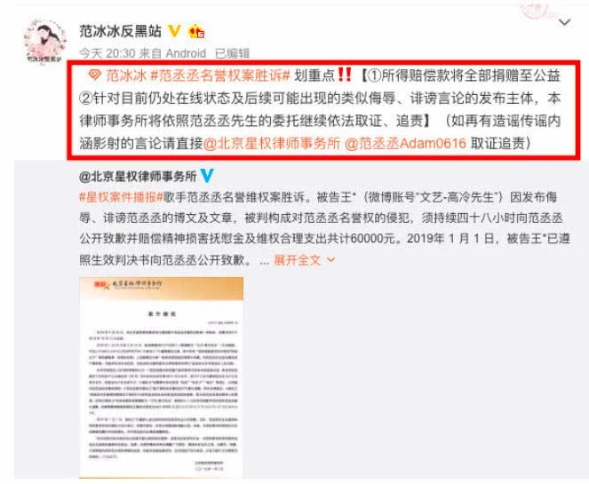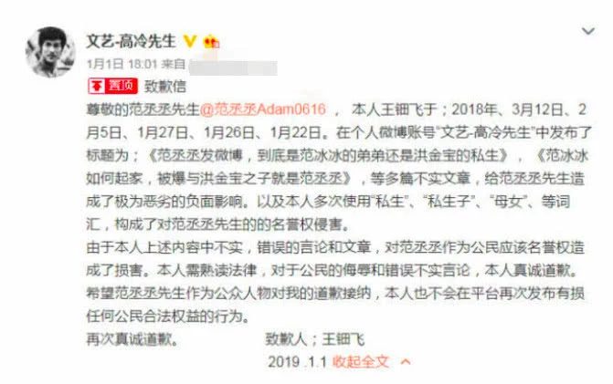 Vào thời điểm ấy, Vương Điền Phi cũng phát Weibo hướng đến Phạm Thừa Thừa công khai nhận lỗi. Sau khi dành chiến thắng trước vụ kiện “Vu khống, xúc phạm danh dự khi tung tin Phạm Thừa Thừa là con trai riêng của Phạm Băng Băng“, phía luật sư của nam ca sỹ tiếp tục thu nhập những chứng cứ xúc phạm trước đó của người này để tiến hành khởi tố.