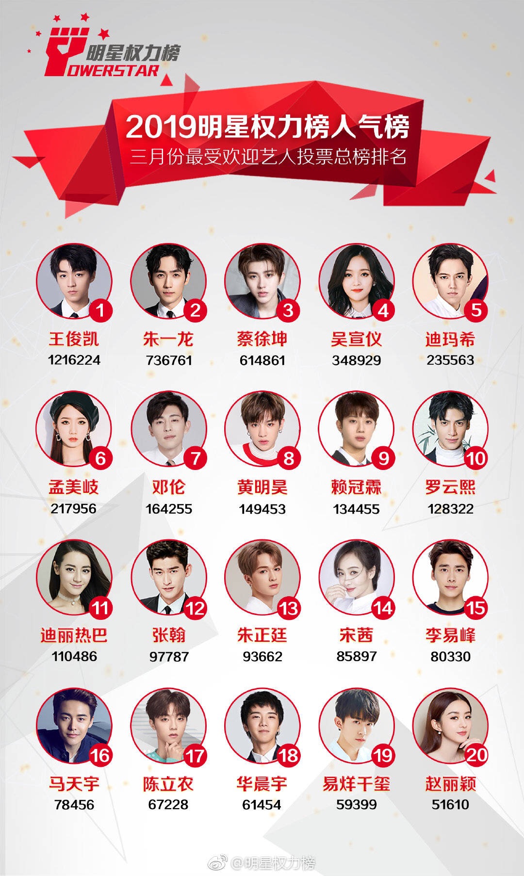 Vào ngày 02/04 vừa qua, Powerstar đã công bố kết quả bỏ phiếu từ cộng đồng người hâm mộ, cư dân mạng trực tuyến cho hạng mục Ngôi sao quyền lực nhất được yêu mến nhất tháng 3 năm 2019. Được biết, kết quả của xếp hạng này hoàn toàn phụ thuộc vào tổng số phiếu bầu từ người hâm mộ dành cho thần tượng của mình ở nhiều quốc gia trong khu vực châu Á không riêng nghệ sĩ Hoa ngữ.
