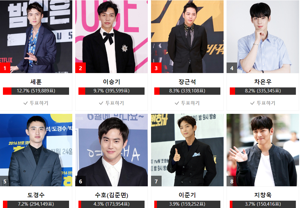Khoảng cách khá xa với Lee Seung Gi, do đó Se Hun chắc chắn giữ giải thưởng trong tay. Trước đó, D.O. đứng nhất nhưng thật không may khi anh ấy bị đẩy xuống hạng 5. Trong khi Jang Geun Suk đã cố gắng rất nhiều mới có thể lên hạng 3, tuy nhiên thời gian không còn nhiều. Thật đáng tiếc!