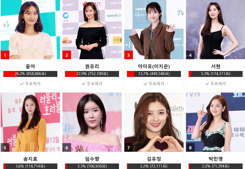 Từ ngày mở cửa cho đến bây giờ, Yoona vẫn luôn giữ vững được vị trí quán quân và Yuri đã vươn lên hạng nhì, cô ấy tiếp tục duy trì thứ hạng của mình trong nhiều ngày.
