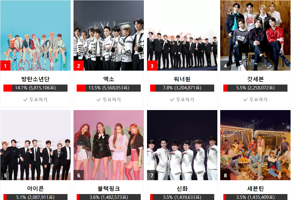 BTS hơn EXO hơn 270.000 phiếu. Dù nhóm nào thắng đi chăng nữa cũng xin chúc mừng lỗ lực của các nhóm, đặc biệt là người hâm mộ trên khắp thế giới của họ.