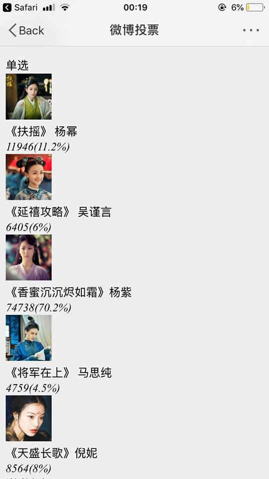 Kết quả bỏ phiếu tính đến thời điểm hiện tại, Nguyễn Kinh Thiên giành được 44,3% tỷ lệ bình chọn, vượt mặt Đặng Luân ở hạng mục nam diễn viên xuất sắc nhất thể loại cổ trang. Còn ở hạng mục nữ diễn viên, Dương Tử với hơn 70% số phiếu bầu đang mạnh mẽ dẫn đầu, theo sát phía sau là Dương Mịch.