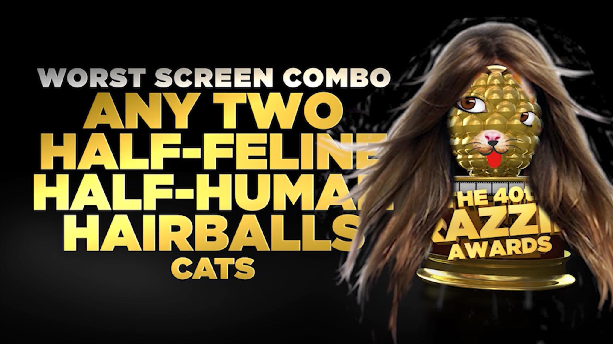 Không nằm ngoài dự đoán của bất kì ai, tựa phim chuyển thể nhạc kịch “nổi tiếng” nhất năm qua Cats đã giành chiến thắng khi mang về tận 6 giải trên tổng số 9 đề cử, trong đó có cả những hạng mục quan trọng nhất như Phim dở nhất, Đạo diễn tệ nhất (dành cho Tom Hooper), Nam phụ & Nữ phụ tệ nhất (dành cho James Corden và Rebel Wilson), ngoài ra còn có hai giải thứ chính là Kịch bản tệ nhất và Combo màn ảnh tệ nhất (dành cho những “cục lông” của bất cứ nhân vật “nhân thú” nào trong phim).