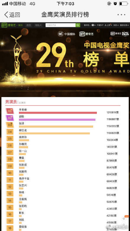 Nếu như trong bảng đề cử tranh giải lần trước (10/9), top 5 nam diễn viên đang dẫn đầu trong cuộc đua tranh giành ngôi vị Nam diễn viên được yêu thích nhất lần lượt là Lý Dịch Phong, Hồ Ca, Liễu Vân Long, Trương Nhất Sơn và Tôn Duy Dân thì đến ngày hôm nay (25/9/2018) thì danh sách này một lần nữa được thay đổi với thứ tự: Lý Dịch Phong, Hồ Ca, Trương Dịch, Liễu Vân Long và Hầu Tường Linh.