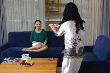 Vân được bà Phương cơm bưng nước rót tận nơi là hình ảnh ngược hẳn với tình cảnh trong phim.