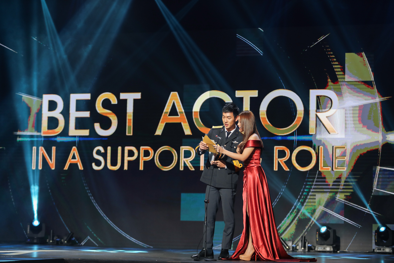 Lần đầu tiên được góp mặt ở lễ trao giải uy tín châu Á, cặp đôi Song Luân - Khả Ngân có cơ hội được gặp gỡ, giao lưu cùng nhiều nghệ sĩ nổi tiếng, các nhà đài, nhà sản xuất và đạo diễn phim khắp châu lục. Xuất hiện tại thảm đỏ sự kiện tối 7/12, Khả Ngân gây ấn tượng bởi bộ đầm đỏ nổi bật, kết hợp với những đường nét cắt xẻ khéo léo khoe vai trần cùng đôi chân dài quyến rũ. Sánh bước bên cô nàng là Song Luân, nam diễn viên diện bộ đồng phục quen thuộc của lính hải quân, làm tôn lên vóc dáng mạnh mẽ, đầy nam tính.