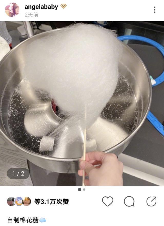 Không dừng lại ở việc làm bánh, Angelababy còn tận dụng thời gian nghỉ ngơi này để làm món ăn vặt nhưng kẹo bông gòn. Nhiều người nói rằng có máy móc thì muốn làm kẹo bông gòn rất dễ dàng nhưng nếu không có kỹ năng thì chắc chắn sẽ làm không được.