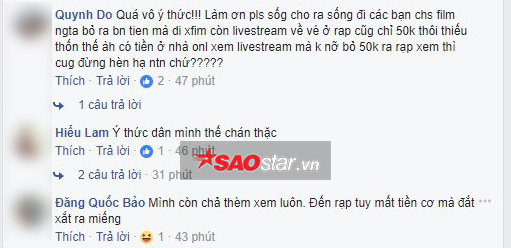 Bạn Nguyễn Chinh cho biết, “một vé xem phim giờ rẻ bèo, bằng ly trà sữa chứ mấy”, chính vì vậy, việc livestream, quay lén phim trong rạp là hành vi không thể chấp nhận được. Bạn Trân Anh còn bổ sung: “Đi ra rạp mà coi, hình ảnh đẹp mắt, âm thanh tuyệt vời, tiếc vì mấy chục ngàn?”