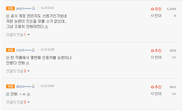 1. [+1,020, -6] Mấy cái người đang quản lý tài khoản này thì đúng là rác rưởi. Không đời nào mấy người không thể biết được. Chắc tôi sẽ ngồi xem phim này đấy (nói móc).