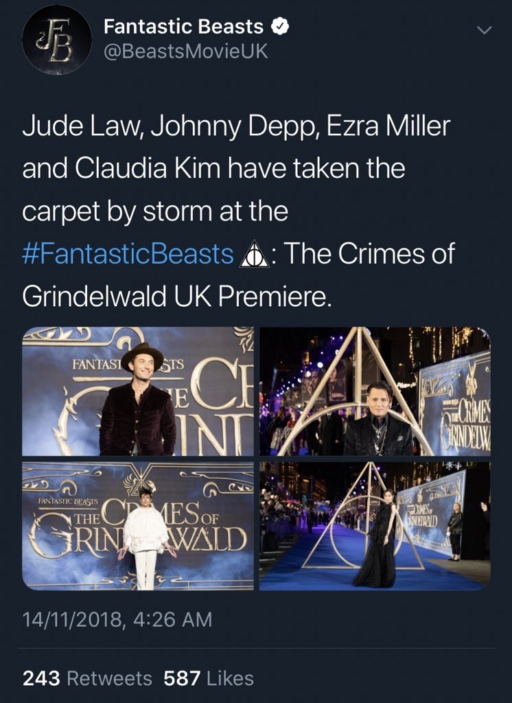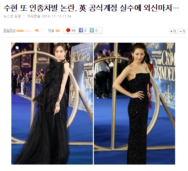 Vừa qua, dư luận bắt đầu xôn xao sau khi tài khoản chính chủ Fantastic Beasts ở Anh của dự án phim điện ảnh Sinh vật huyền bí: Tội ác của Grindelwald (Fantastic Beasts: The Crimes of Grindelwald) trên twitter đăng hình ảnh của các diễn viên tại sự kiện công chiếu phim ở thủ đô London gồm Jude Law, Johnny Depp, Ezra Miller và nữ diễn viên người Nhật Bản - Mirei Kiritani kèm theo chú thích nói rằng cô gái đó là Claudia Kim (Kim Soo Hyun) - người đảm nhận vai Nagini.