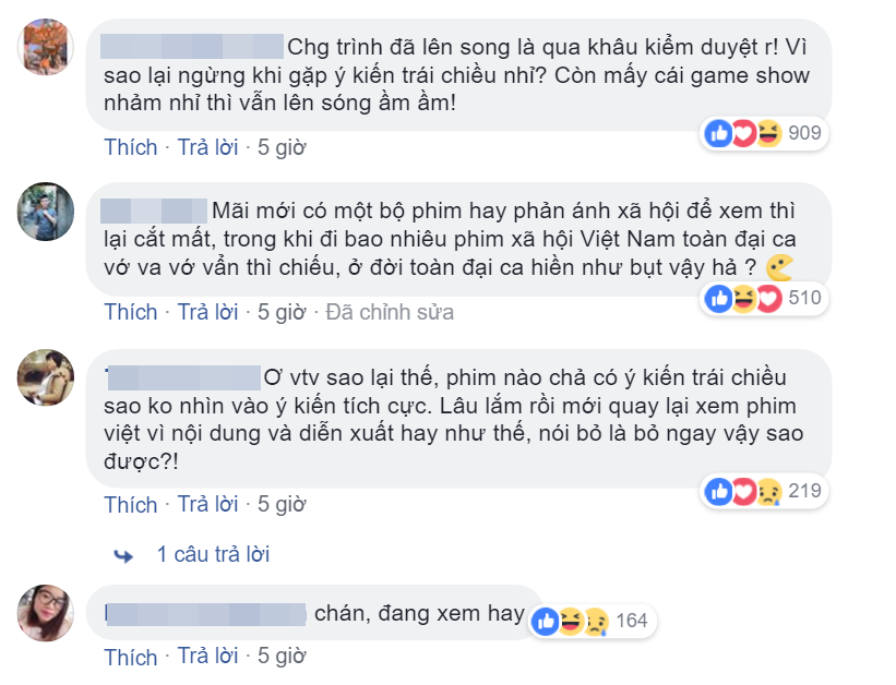 Khán giả bất bình: “Chương trình đã lên sóng là qua khâu kiểm duyệt rồi! Vì sao lại ngừng khi gặp ý kiến trái chiều nhỉ? Còn mấy cái game show nhảm nhỉ thì vẫn lên sóng ầm ầm!”. “Mãi mới có một bộ phim hay phản ánh xã hội để xem thì lại cắt mất, trong khi đi bao nhiêu phim xã hội Việt Nam toàn đại ca vớ va vớ vẩn thì chiếu, ở đời toàn đại ca hiền như bụt vậy hả ?” - Một cư dân mạng khác lên tiếng.