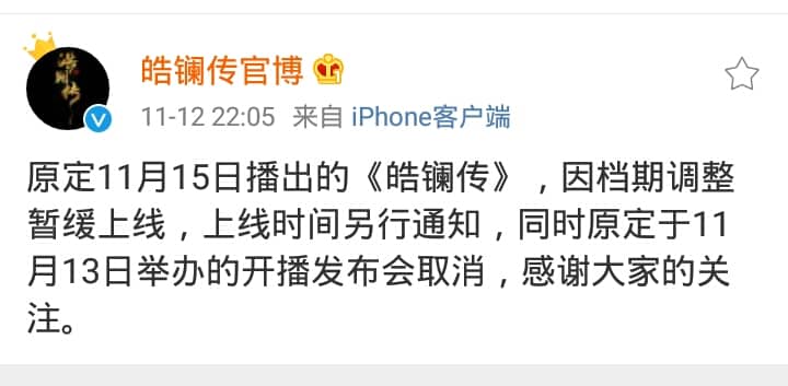 Khi mọi thứ dường như đã chuẩn bị xong thì bất ngờ, trước ngày lên sóng weibo chính thức của đoàn làm phim Hạo Lan truyện đăng lên thông báo: “Hạo Lan truyện vốn định ngày 15 tháng 11 lên sóng nhưng tạm thời sẽ bị hoãn chiếu vì đang điều chỉnh lịch. Thời gian chiếu sẽ thông báo sau. Đồng thời buổi họp báo ngày 13 tháng 11 cũng sẽ bị hủy bỏ. Cảm ơn sự quan tâm của mọi người”.