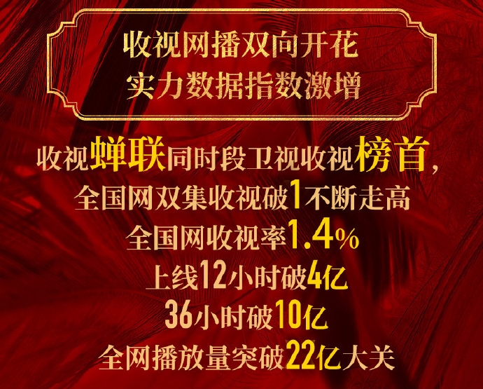 Tỉ lệ xem trên mạng toàn quốc là 1.4%. Phát sóng 12 tiếng dc 400.000.000 người xem. 36 tiếng dc 1 tỷ người xem. Lượng phát sóng toàn mạng vượt 2,2 tỷ