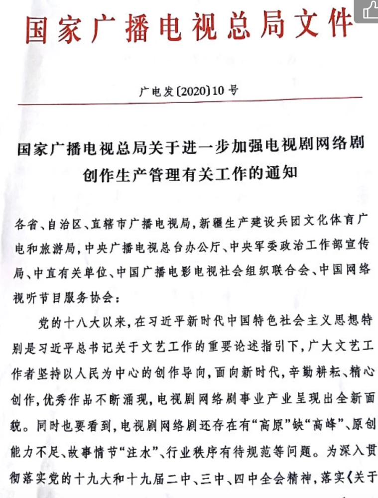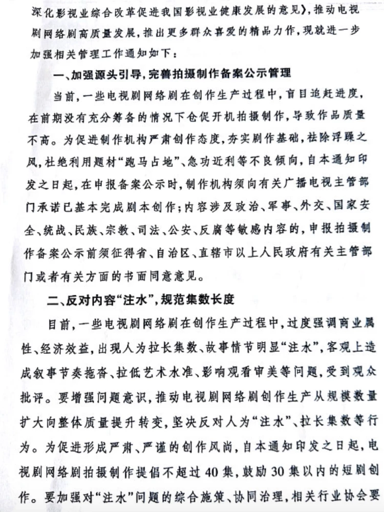 Văn bản nhấn mạnh việc phản đối những tác phẩm cố tình kéo dài, thêm thắt những tình tiết rườm rà không đáng có nhằm tăng số tập. Tổng cục yêu cầu những nhà làm phim truyền hình và webdrama không được vượt quá 40 tập và khuyến khích tạo ra các bộ phim truyền hình ngắn trong vòng 30 tập.