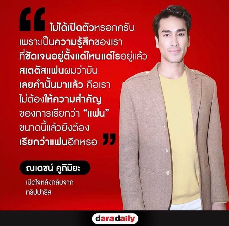 Thật may mắn, khi các phóng viên Thái có cơ hội gặp gỡ Nadech sau chuyến đi từ Pháp về. Chắc chắn rằng đây sẽ là cơ hội để hỏi han Nadech về chuyện tình cảm với Yaya. Nadech liên tiếp nhận được các câu hỏi liên quan đến chuyện tình của mình hiện tại. Khi được phóng viên đưa câu hỏi: “Thế giờ bọn em là người yêu của nhau chưa?”, Nadech không ngần ngại đáp: ‘Bây giờ còn phải hỏi câu này ạ, tụi em còn hơn cả mức người yêu.’