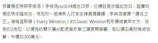 Nam ca sỹ còn đăng tải hình ảnh chiếc nhẫn đính hôn vô cùng lấp lánh đã được đeo trên tay của Dương Thừa Lâm. Theo truyền thông Đài Loan tiết lộ, Lý Vinh Hạo đã có dụng ý đặc biệt lựa chọn chiếc nhẫn mang tên Vua Kim Cương, kích thước nhẫn nặng cỡ 2 carat. Trị giá của chiếc nhẫn lên đến 600 ngàn NDT (tương đương 2 tỷ đồng). Xem ra Lý Vinh Hạo vô cùng có thành ý và dành hết tâm tư của mình đặt vào chuyện cầu hôn này.