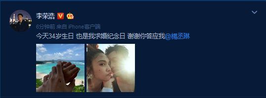 Sáng hôm nay, Lý Vinh Hạo đăng weibo hạnh phúc khoe với toàn thể công chúng và người hâm mộ tin vui anh đã chính thức cầu hôn Dương Thừa Lâm thành công vào đúng ngày sinh nhật tuổi 34 của mình. Nam ca sỹ chia sẻ với dòng trạng thái: “Hôm nay là sinh nhật 34 tuổi của anh, cũng là ngày kỷ niệm cầu hôn của anh, cám ơn em đã đồng ý lấy anh“.