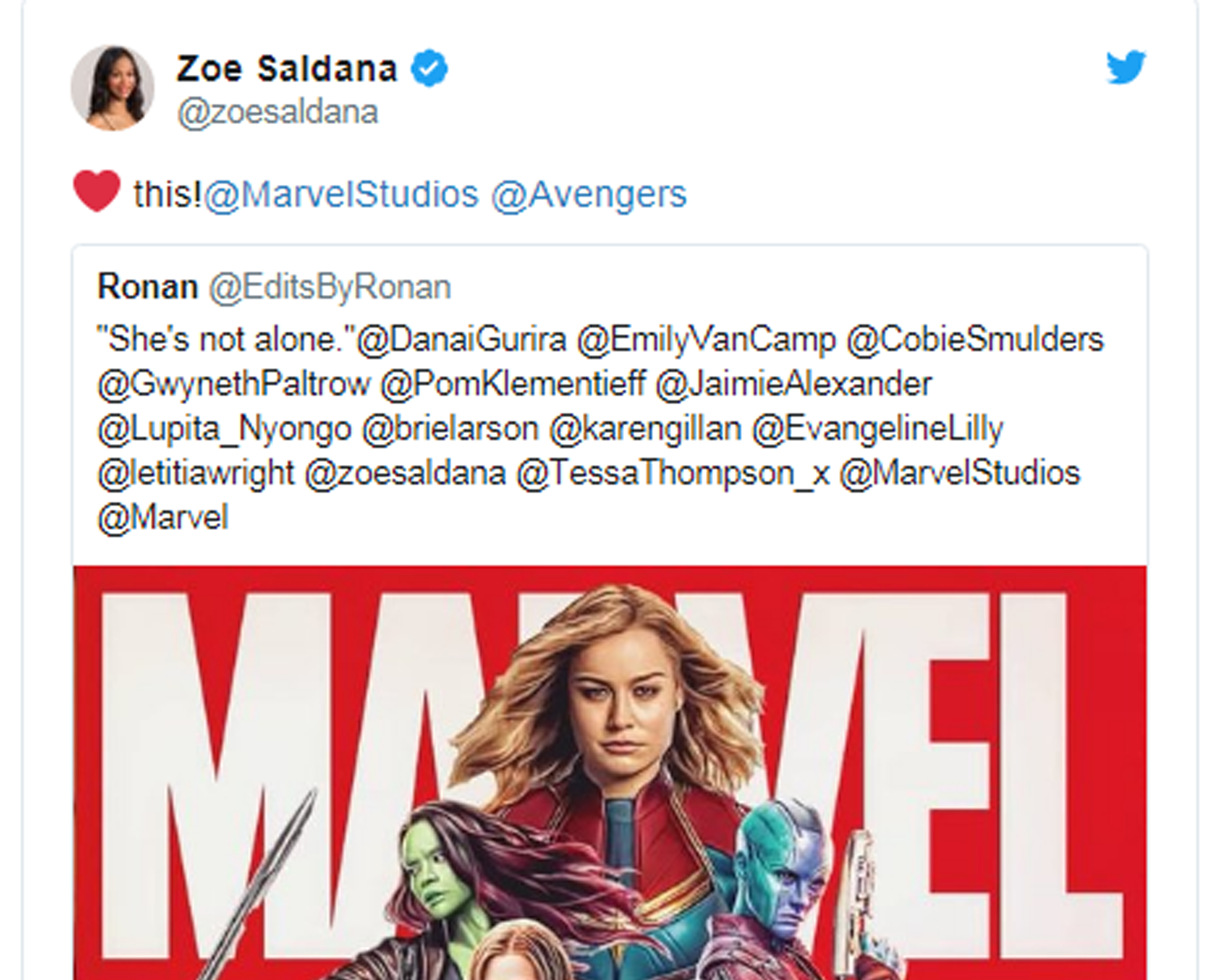 Khán giả không phải là người hâm mộ duy nhất thích tấm poster này, diễn viên Zoe Saldana cũng đã chia sẻ bài post của Ronan và cô đã cảm thấy hạnh phúc khi nhìn thấy tất cả các nhân vật nữ trong MCU cùng xuất hiện trong một tấm ảnh.