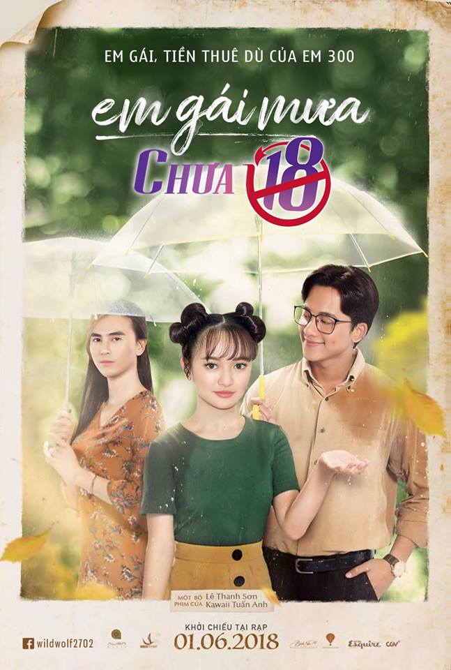 “Mình hợp nhau đến như vậy thế nhưng không phải… tình yêu như món quà khi có nhau đừng quên là…” - đây rất có thể sẽ trở thành lời của ca khúc chủ đề cho bộ phim “Em gái mưa chưa 18”. Xét đi xét lại thì em gái mưa trong bản gốc si mê thầy Mai Tài Phến cũng đã đủ tuổi thi lấy bằng lái xe đâu, bé cũng chỉ có thể đạp xe dưới mưa như Kaity Nguyễn thôi mà. Vì vậy, trộn cả hai em gái mưa này vào bộ phim, có lẽ nhà sản xuất lúc này nên cân nhắc đến cái tên “Những em gái bão tố”. Về phần thầy Phến, chắc thầy chỉ có nước bỏ làng, bỏ xã, bỏ xứ, bỏ quê mà đi thôi, ở lại không chừng bị một em lừa tình, bị một em lừa cho ăn tát dưới mưa, đau khổ không ai bằng! Mọi người đừng nhìn Will trên poster nha, dễ thương lắm đó.
