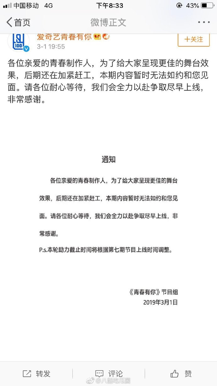 Thế nhưng, đang công chiếu giữa chừng thì ekip chương trình bất ngờ tuyên bố đình chiếu vào chiều hôm nay với lý do để mang đến hiệu quả tốt hơn, hậu kỳ đang gấp rút làm việc nên nội dung kỳ này tạm thời không thể trình chiếu đúng hẹn.