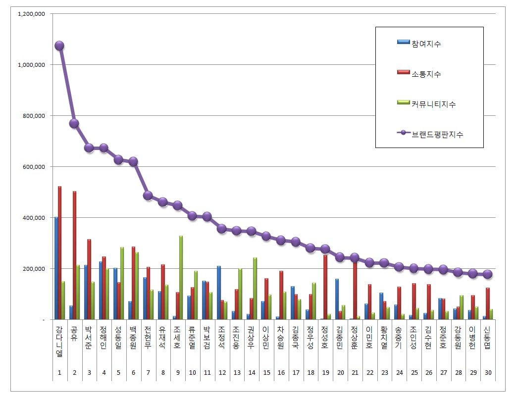 “Center quốc dân” Kang Daniel của Wanna One đứng đầu bảng xếp hạng trong tháng này với 1.073.888 điểm. Những từ khóa liên quan đến thứ hạng cao nhất của nam thần tượng trong tháng này bao gồm “dễ thương”, “tôi thích anh ấy” và “đẹp trai”.