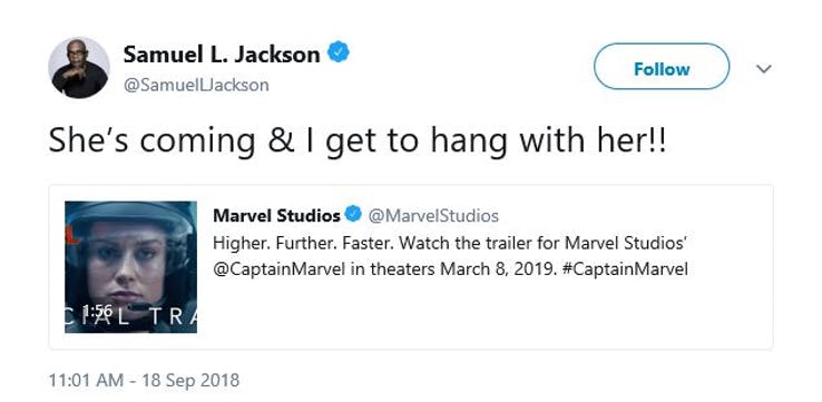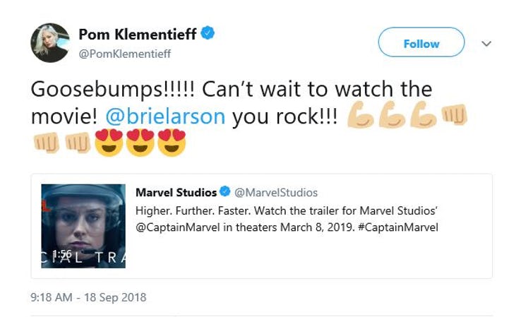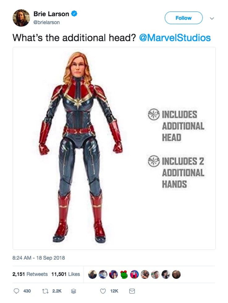 Ngoài các ngôi sao ở trên, nhân vật chính của bộ phim Captain Marvel - Brie Larson cũng đã có những phản ứng đầu tiên về một số hình ảnh và đoạn trailer bộ phim riêng của cô. Cụ thể hơn, thông qua Twitter của mình, Larson đã hỏi đùa Marvel rằng “cái đầu bổ sung” có ý nghĩa là gì?